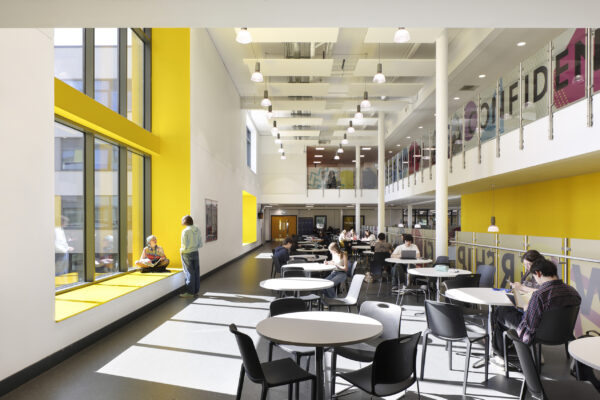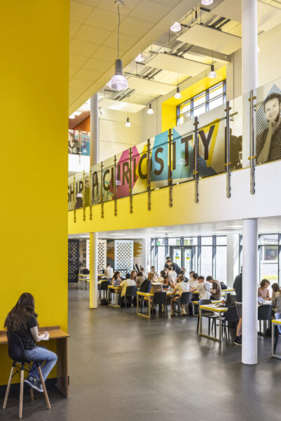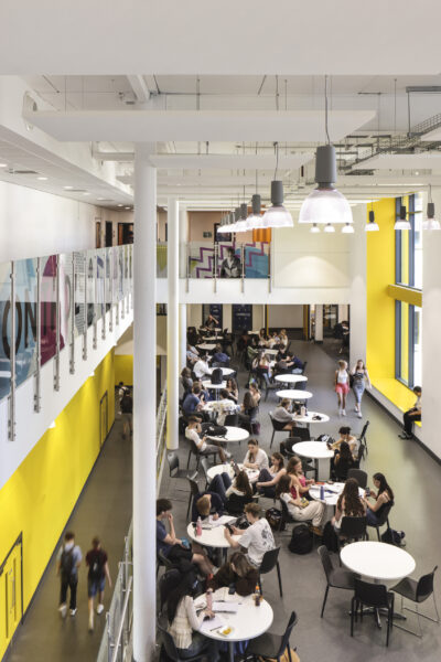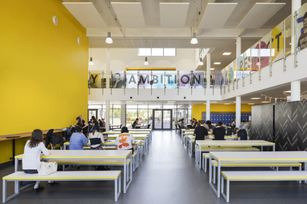 The building offers several large, multipurpose spaces that support a variety of uses, including a hall space with capacity for 350 seats. On the ground floor, visibility from the central dining area to the art and design department allows the college to celebrate and showcase student work. Flexible teaching and learning suites support the college’s “highly ambitious ‘super-curriculum’”, praised in its 2023 ‘outstanding’ Ofsted report.