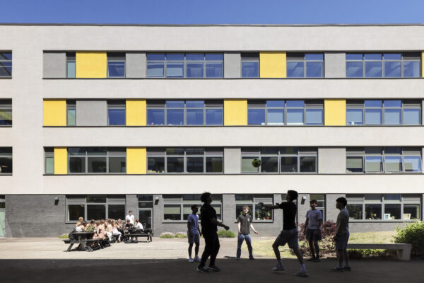 Arranged as an open sided courtyard with ‘fingers’ of accommodation extending into the landscape, the building itself acts as an acoustic buffer. The finger-block design, which also facilitated a phased construction programme, creates a semi-enclosed courtyard area for dining, outdoor learning and recreation. The steel-framed structure enables a largely column-free design, allowing for future adaptability and reconfiguration.