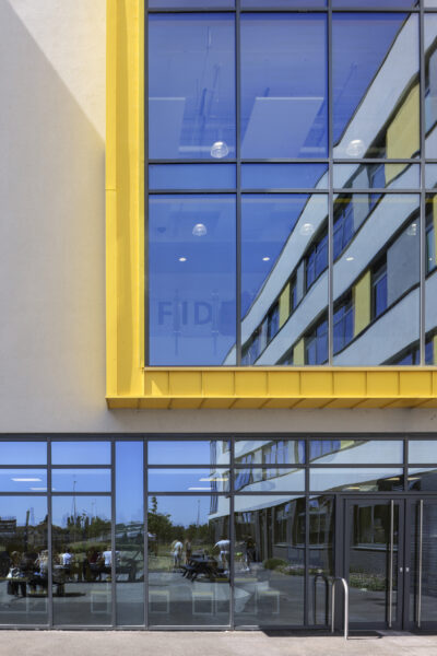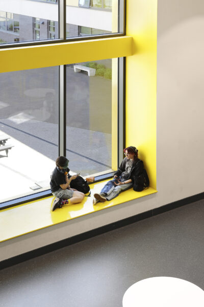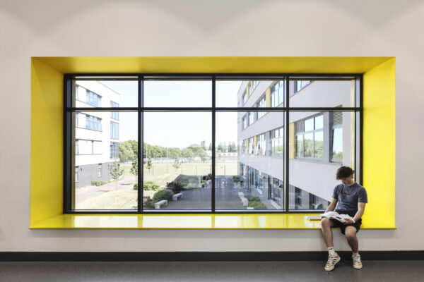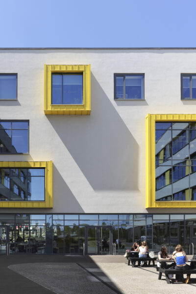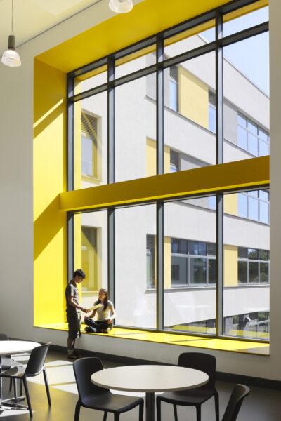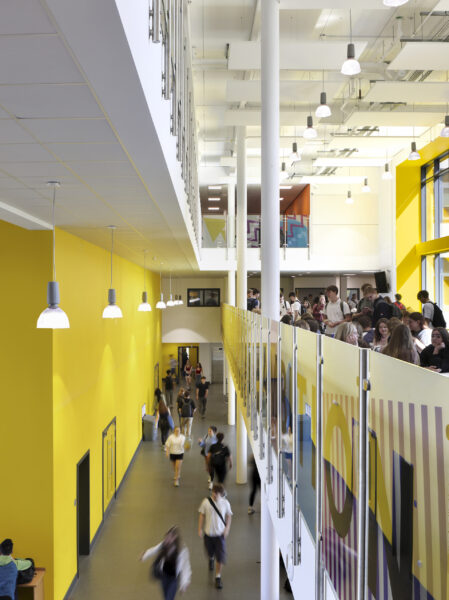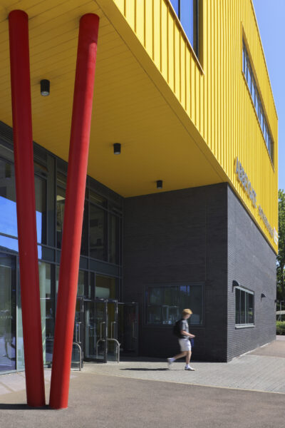 Architectural emphasis is focused on the public frontage, where the hall spaces project beyond the face of the building, over-sailing a cut-back entrance. In bold yellow cladding, that contrasts with the restrained dark brick used elsewhere, the entrance announces the new college to its community and provides a dynamic welcome for students and visitors.