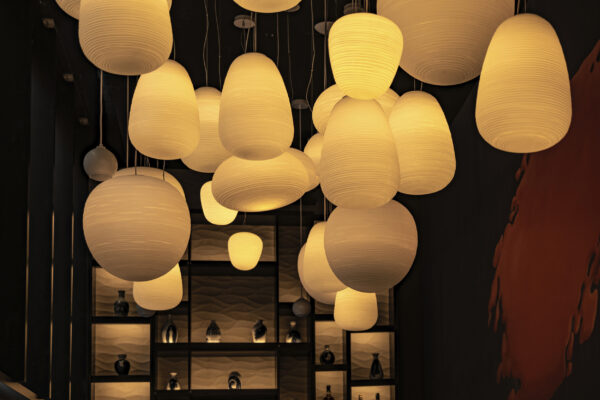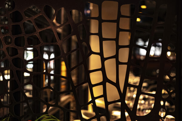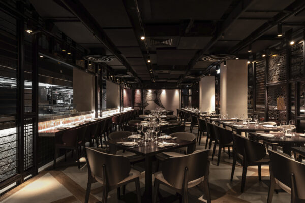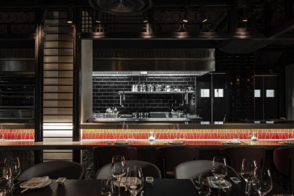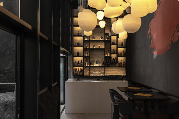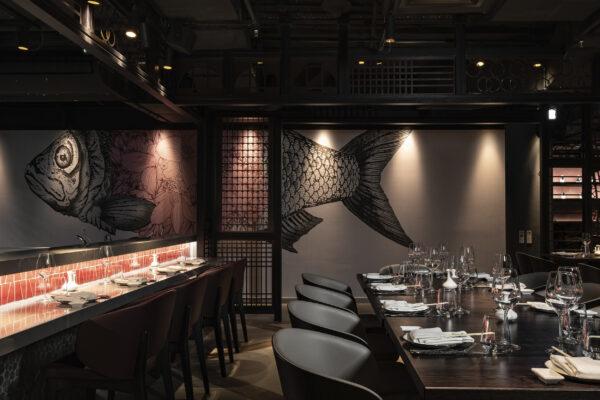 The material palette responds to the restaurant’s Japanese-Peruvian, or Nikkei, culinary identity with a layered and theatrical interior. A sustainably sourced inky black timber screen wraps the restaurant and lounge bar, forming a cage-like enclosure with a fine pattern derived from dragonfly wings. Above the triple-height entrance, 40 paper-thin Japanese lanterns create a dramatic focal point, while a large bespoke koi mural brings depth and visual focus to the end wall.